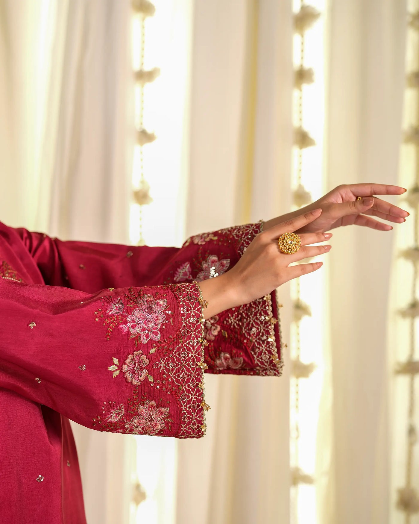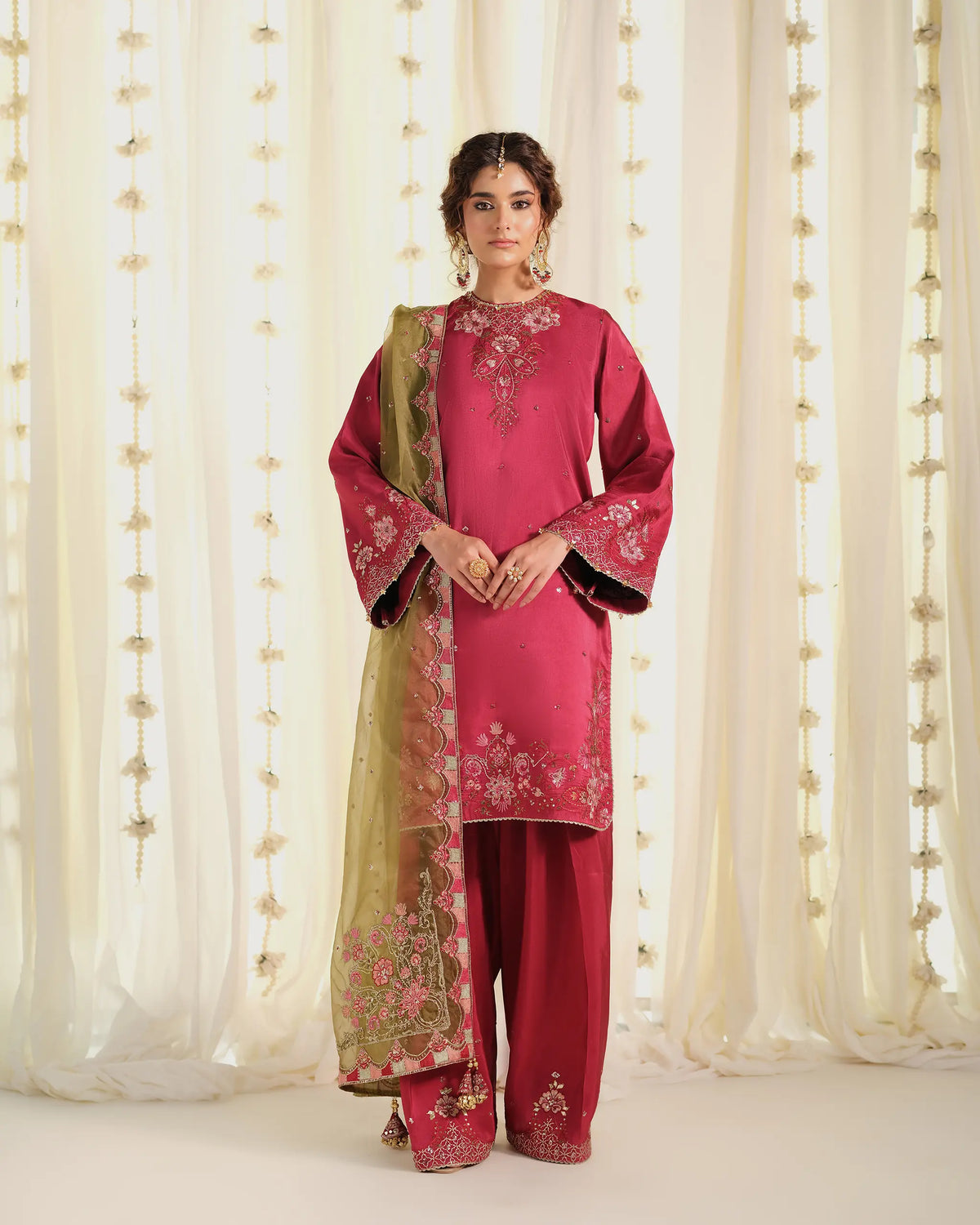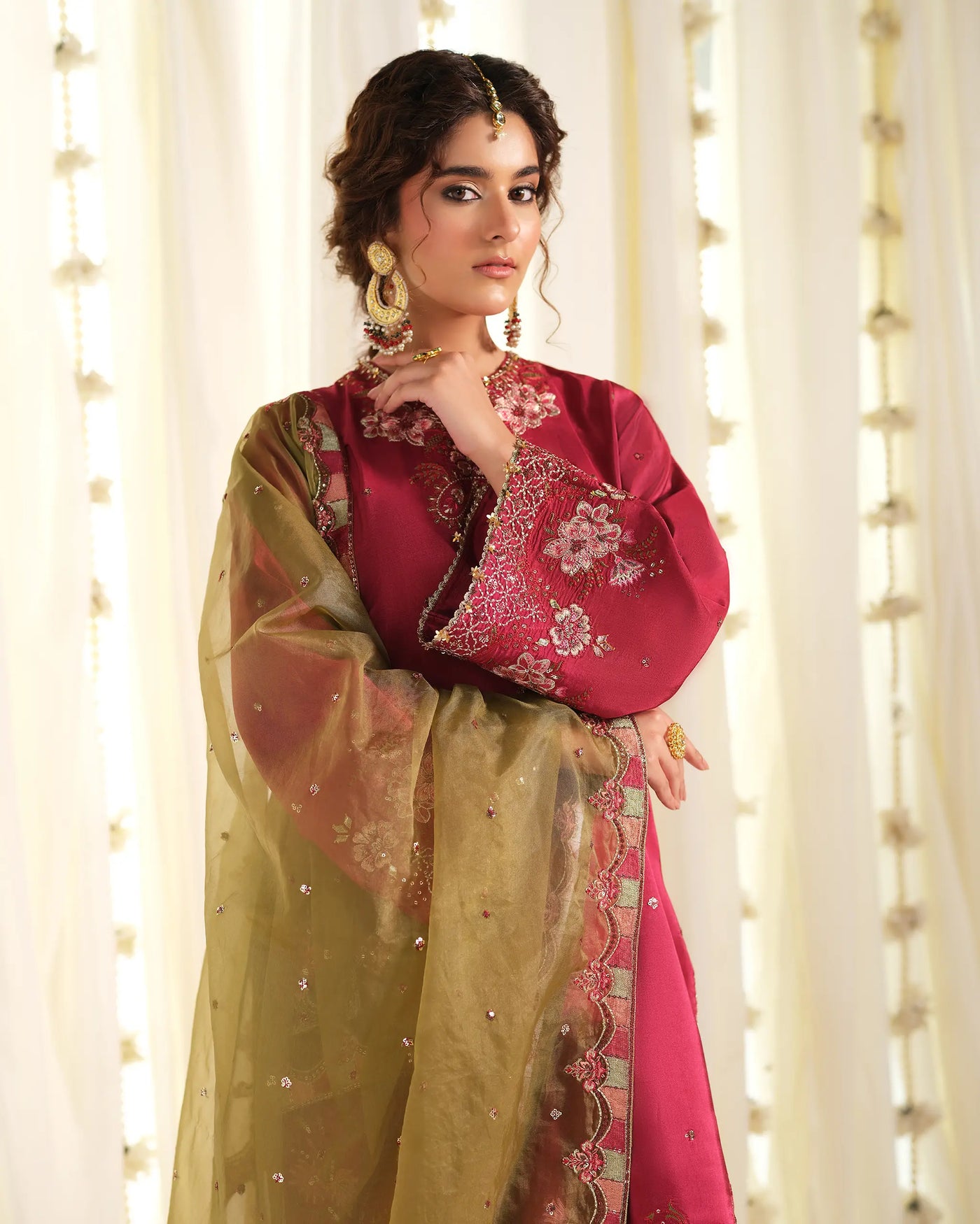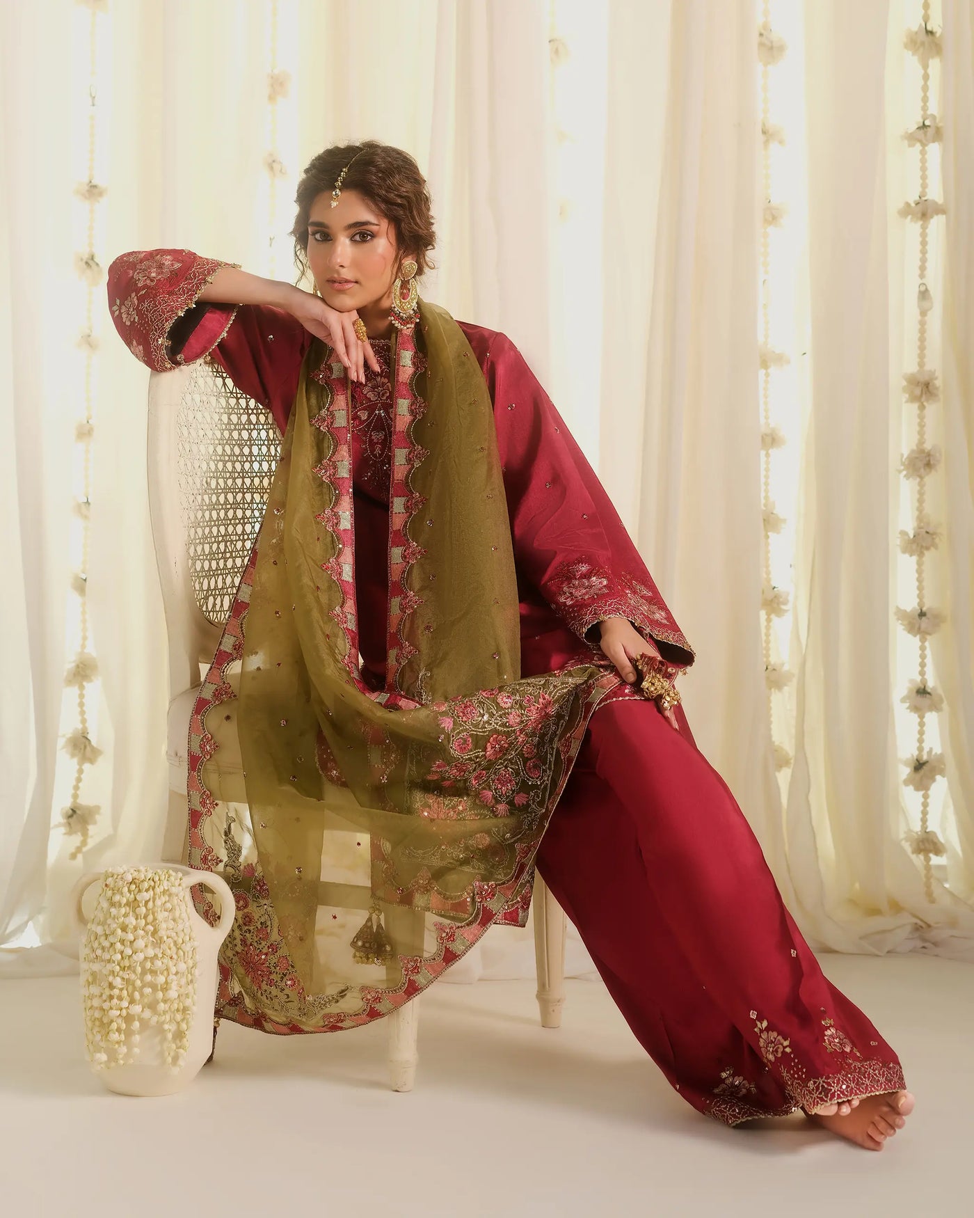 Celebrate the season with Sinoor’s “Pehla Khat” unstitched collection, a luxurious red tencel silk shirt and trouser set 'Chahat', featuring exquisite embroidery, intricate tilla work, shimmering sequins, and delicate thread work. The ensemble is elevated by a contrasting green organza dupatta embroidered along the borders, adding a striking pop of colour and refined luxury. Designed for both comfort and festive sophistication, this unstitched article lets you customize your fit while embracing elegance at every event. Perfect for Weddings, Eid or any special occasion.