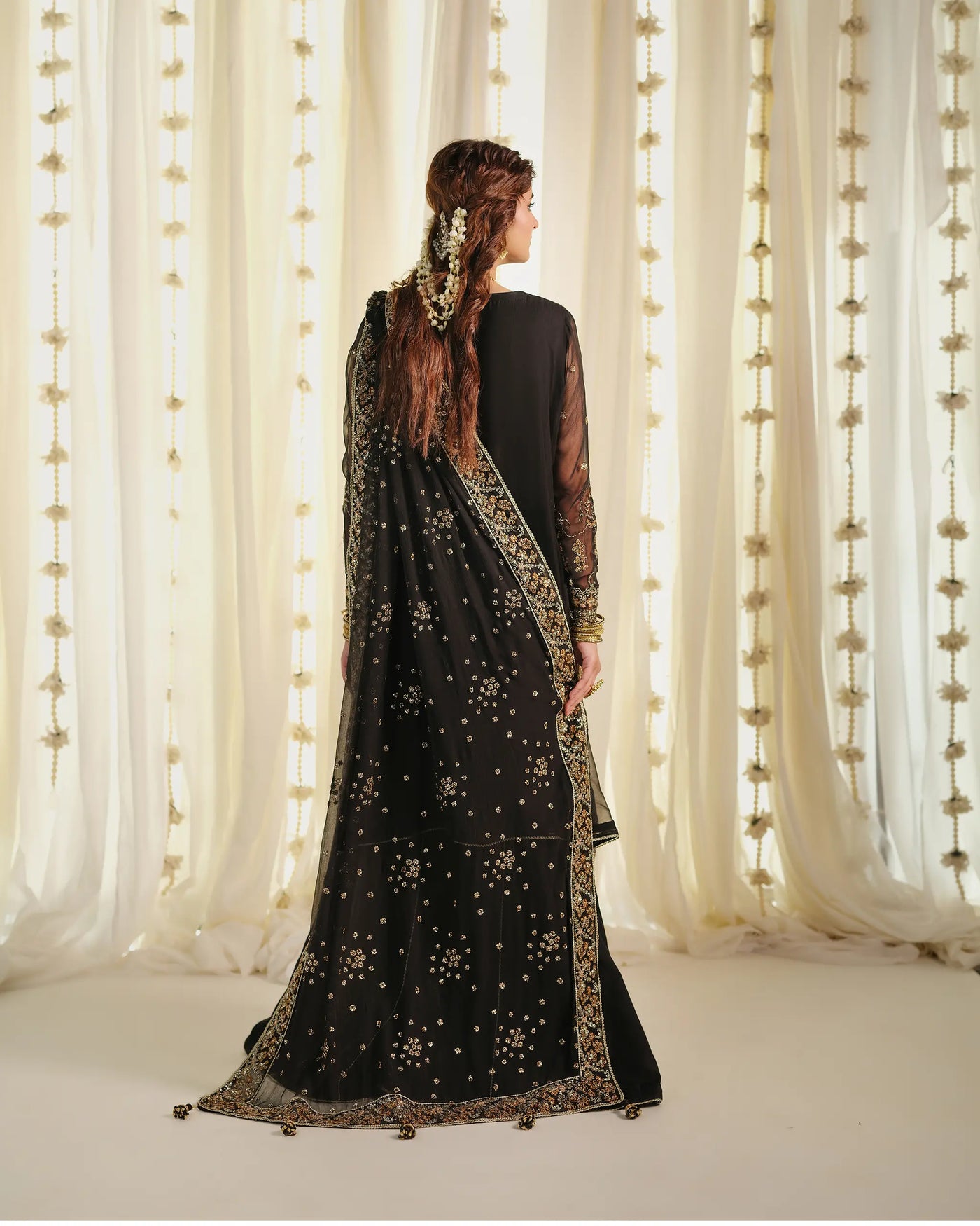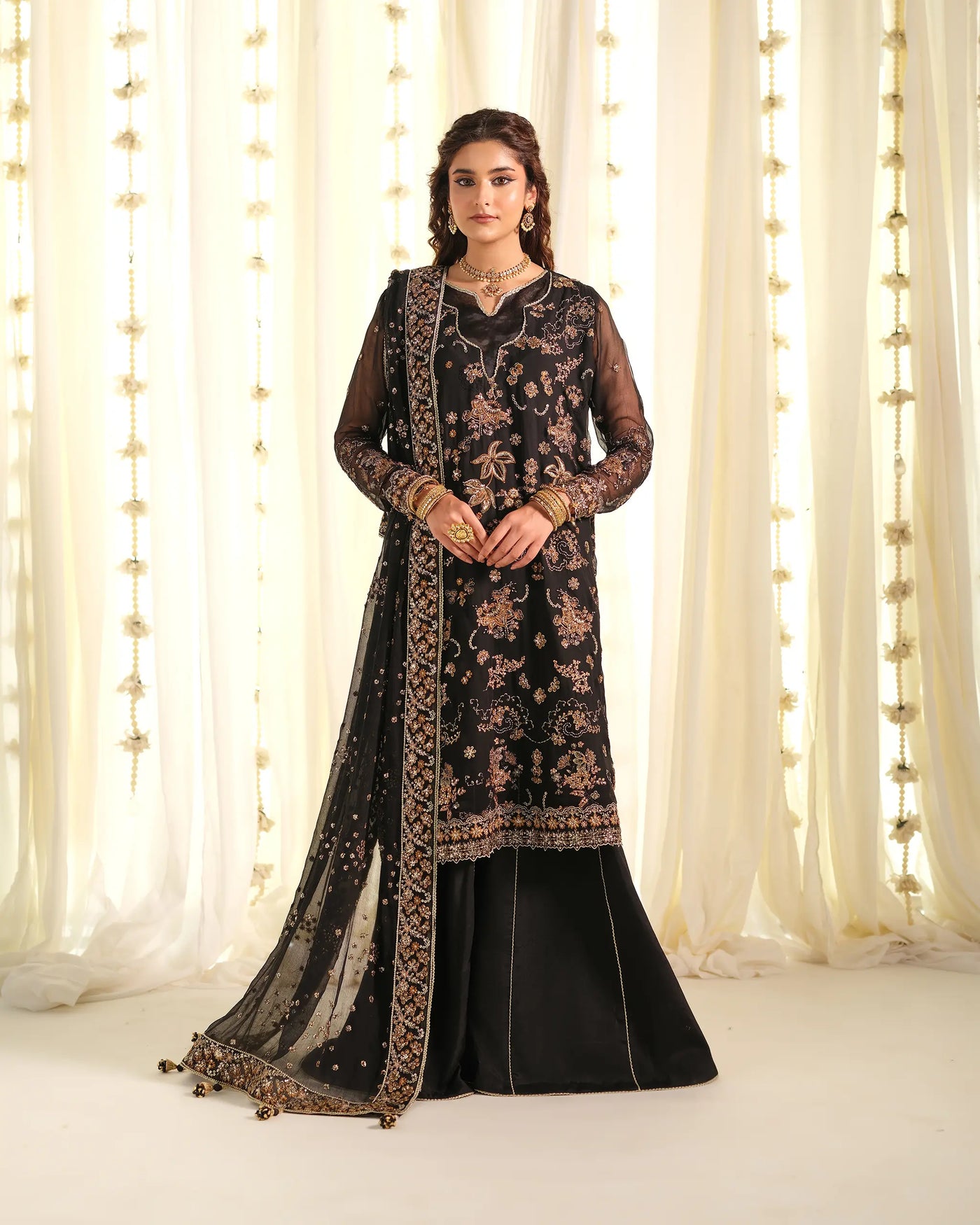 Experience refined sophistication with Sinoor’s “Pehla Khat” unstitched festive collection, featuring a luxurious black chiffon sharara set 'Mahtaab', designed to elevate your formal wardrobe. This ensemble includes a flowy chiffon shirt adorned with exquisite thread embroidery, radiant tilla work, and shimmering sequins, blending traditional Pakistani craftsmanship with contemporary elegance. The matching black chiffon sharara and richly embellished chiffon dupatta provide graceful movement and a regal finish, making this outfit ideal for evening events, weddings, and festive celebrations.
